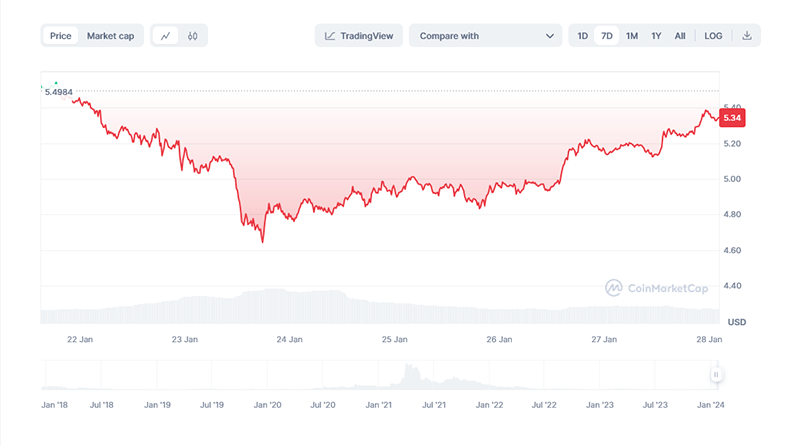 این توکن 2.70 درصد کاهش یافته است و در زمان انتشار این مقاله با قیمت 5.35 دلار معامله میشود.