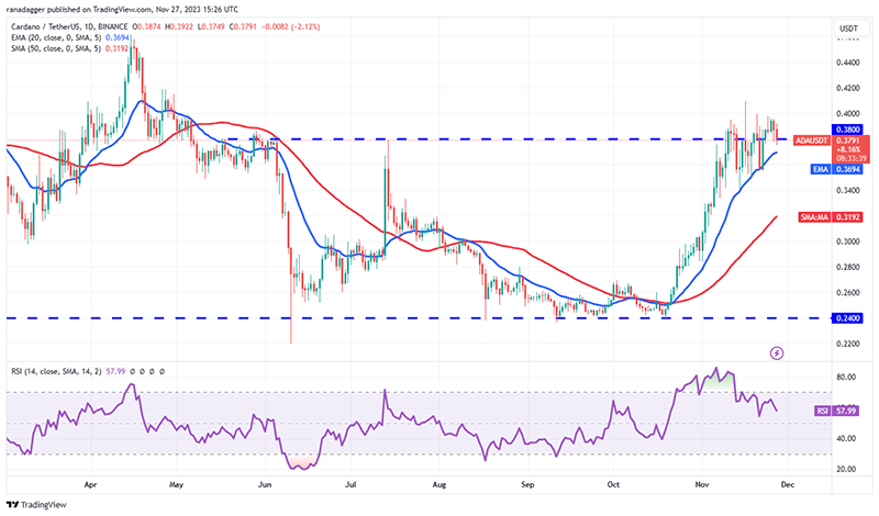جفت ADA/USDT می تواند به میانگین متحرک نمایی 20 روزه (0.37 دلار) سقوط کند که احتمالا خریداران را به خود جذب خواهد کرد. اگر قیمت با قدرت از این سطح جهش کند، این نشان می دهد که روند مثبت باقی می ماند و معامله گران در حال خرید کاردانو با کاهش هستند. سپس گاوها یک بار دیگر تلاش خواهند کرد تا با 0.40 دلار بر مقاومت غلبه کنند. در صورت موفقیت، جفت ممکن است تا 0.46 دلار افزایش یابد.