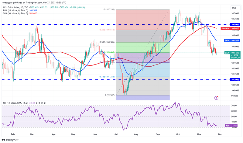 شاخص دلار آمریکا (DXY) تلاش کرد تا از سطح 50 درصدی فیبوناچی اصلاحی 103.46 در 21 نوامبر بهبود یابد، اما خرسها تمایلی به تسلیم شدن نداشتند.