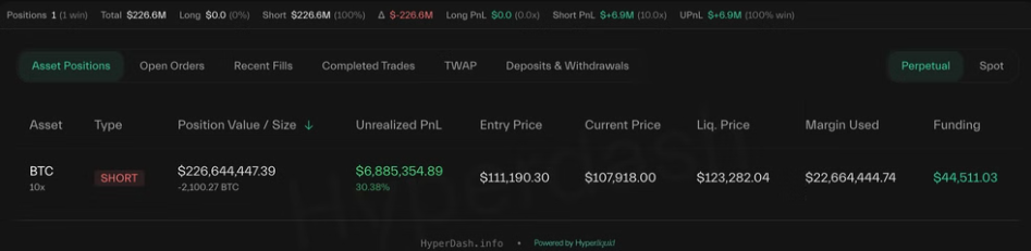 او یک پوزیشن فروش (Short) عظیم به ارزش ۲۲۶.۶ میلیون دلار روی بیت کوین (BTC) باز کرده است.