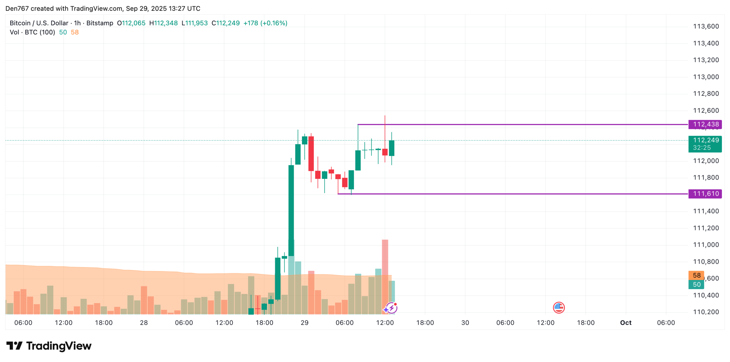 در نمودار یک‌ساعته، BTC یک شکست جعلی از مقاومت محلی ۱۱۲,۴۳۸ دلار داشته است. اگر کندل روزانه در نزدیکی یا بالاتر از این سطح بسته شود، احتمال تست محدوده ۱۱۳,۰۰۰ دلار وجود دارد.