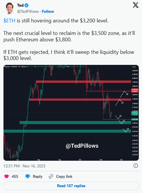 اما اگر ETH نتواند این مقاومت را پس بگیرد، احتمال افت به زیر ۳۰۰۰ دلار وجود دارد که میتواند باعث جمعآوری نقدینگی (Liquidity Sweep) در سطوح پایین شود.