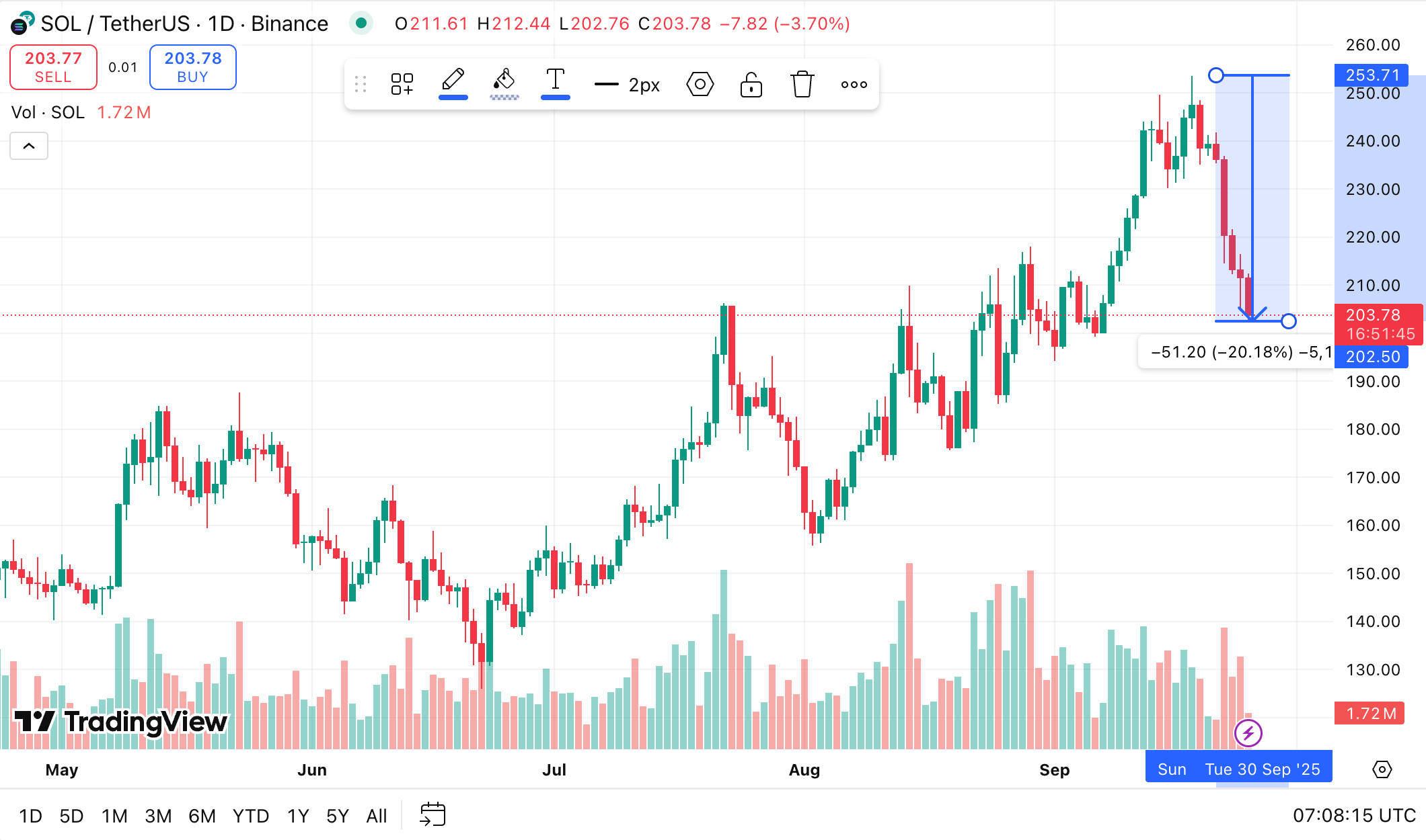 طبق دادههای BeInCrypto، سولانا در حال حاضر در محدوده ۲۰۳.۷۸ دلار معامله میشود که ۲۰.۱۸٪ کمتر از سقف محلی اخیر خود در ۱۸ سپتامبر است.