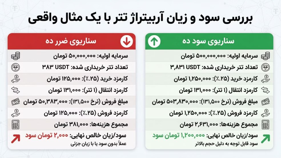 💰 آربیتراژ تتر چیست؟ آموزش کامل محاسبه سود، کارمزدها و ریسکهای واقعی