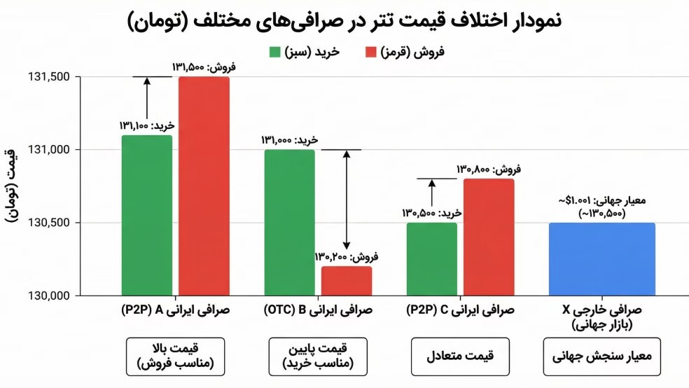 با اینکه تتر همواره معادل یک دلار آمریکا در نظر گرفته میشود، اما در عمل قیمت آن در صرافیهای مختلف یکسان نیست. همین اختلافهای جزئی — که گاهی فقط چند سنت یا چند صد تومان است — زمینهای را فراهم میکند که به آن «آربیتراژ تتر» گفته میشود.