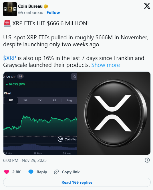 رویداد مهم دیگر این است که ETFهای اسپات XRP در آمریکا تنها طی دو هفته پس از عرضه، حدود ۶۶۶.۶ میلیون دلار ورود سرمایه داشتهاند. طی هفت روز گذشته نیز ارزش XRP حدود ۱۶ درصد افزایش یافته و شرکتهایی مانند گریاسکیل و فرانکلین از محصولات ETF خود حمایت کردهاند.